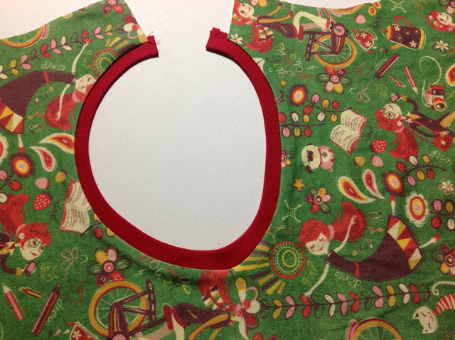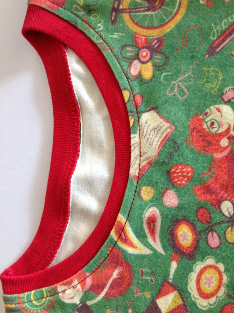 I've made the long sleeved version of the pattern and chose red ribbing for the neck and sleeve cuff bands. Even without an overlocker, it is still easy to finish the neckline neatly.