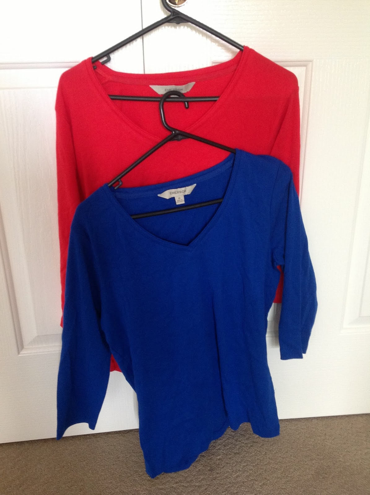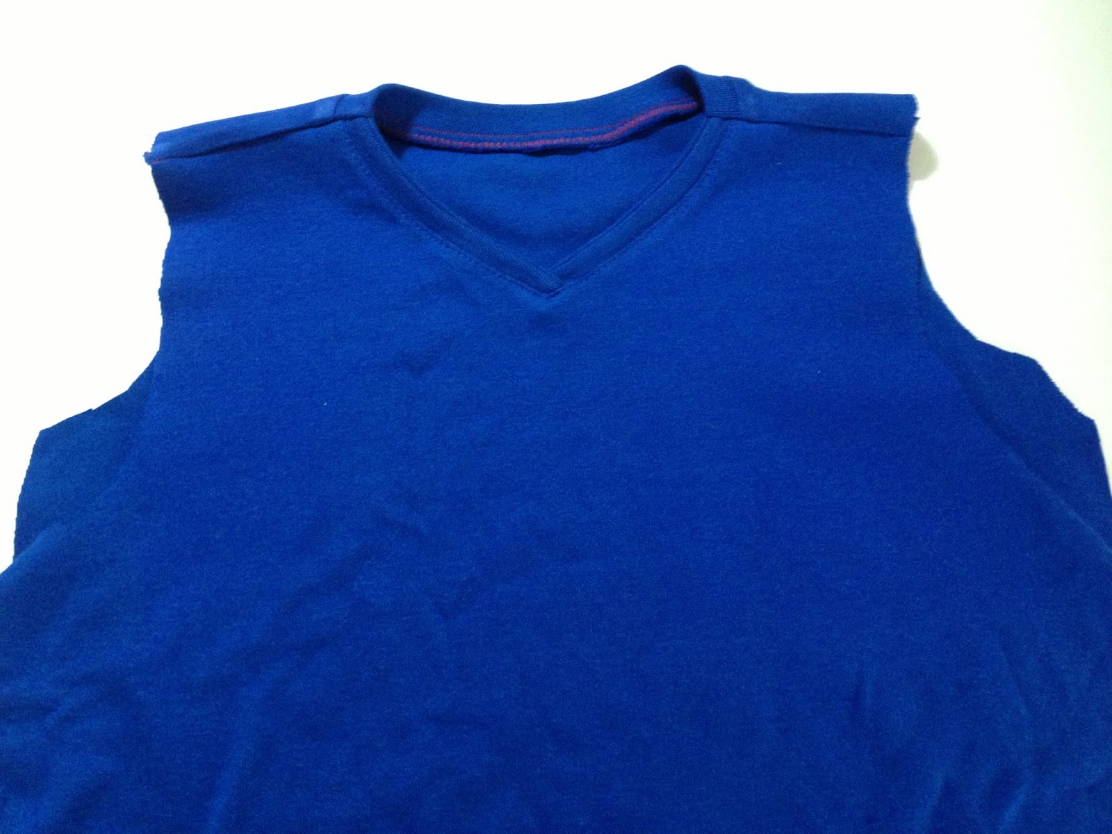 I've kept the front v-neckline of the blue shirt but used a piece of the blue to finish of the back neckline.
