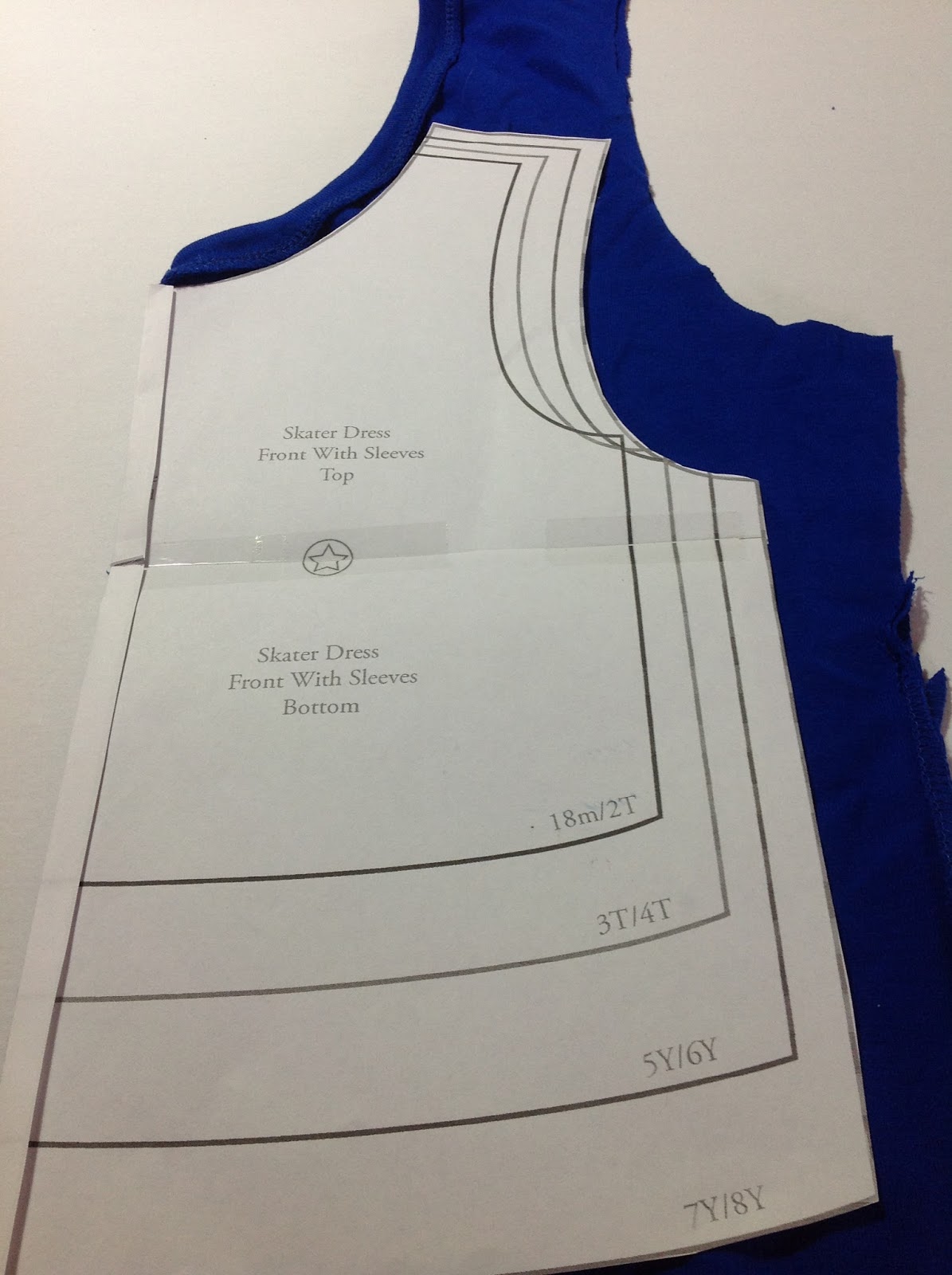 Then I divided the blue parts in half again, added another red strip and sewed it all together. Finally, I've placed the pattern piece on the new sleeve piece and trimmed it to an exact fit.