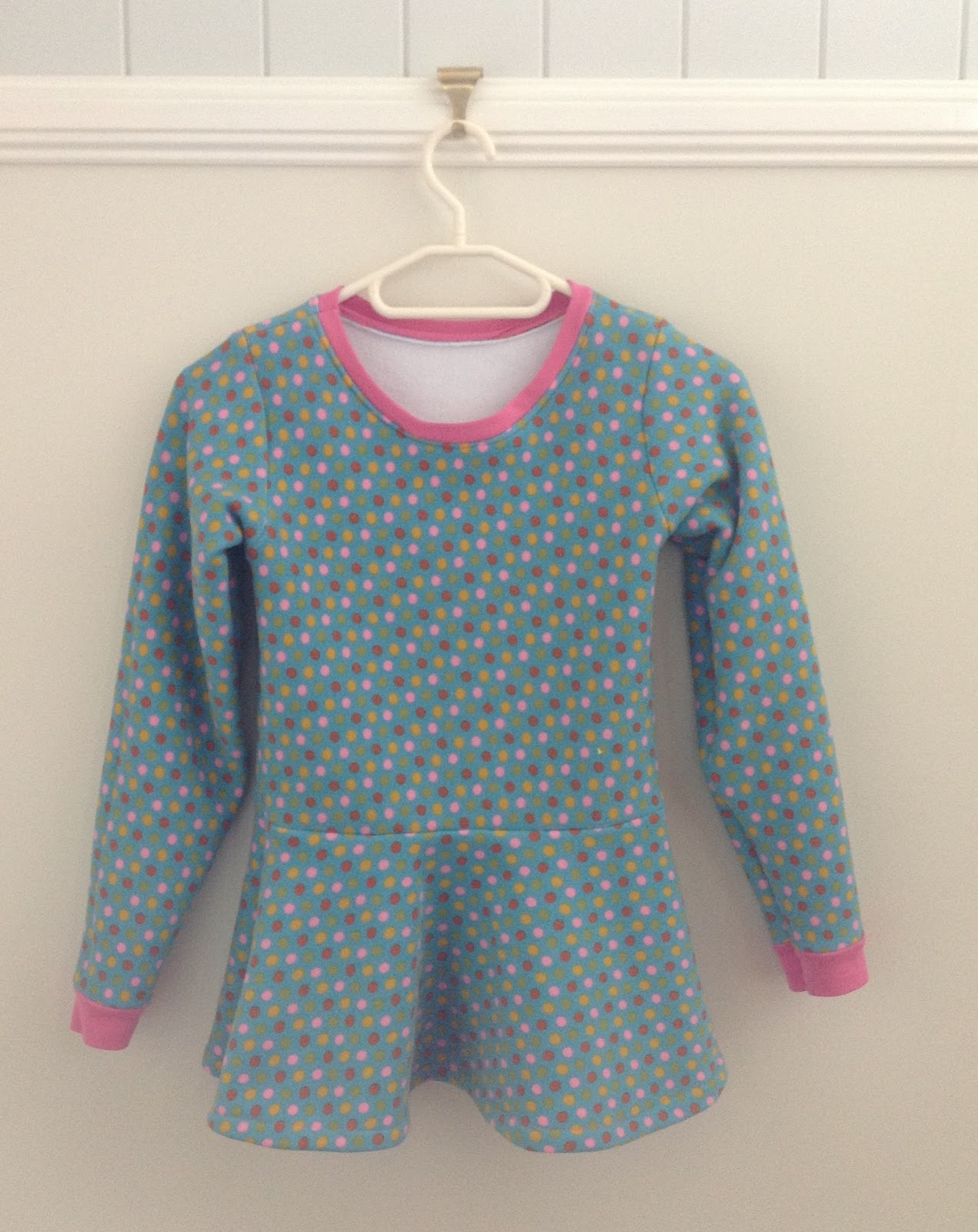 I bought this very cute dotty fleece from Spotlight and made Celine a long-sleeved version of the Skater Peplum.. now if Winter actually shows up around here, she might get to wear it. Seriously, what's up with the weather Down Under?? I know we normally do only have around 3 weeks of Winter (and not continuously I might add), but I cannot help fear for the coming Summer, if we don't start to get some real Winter weather soon!