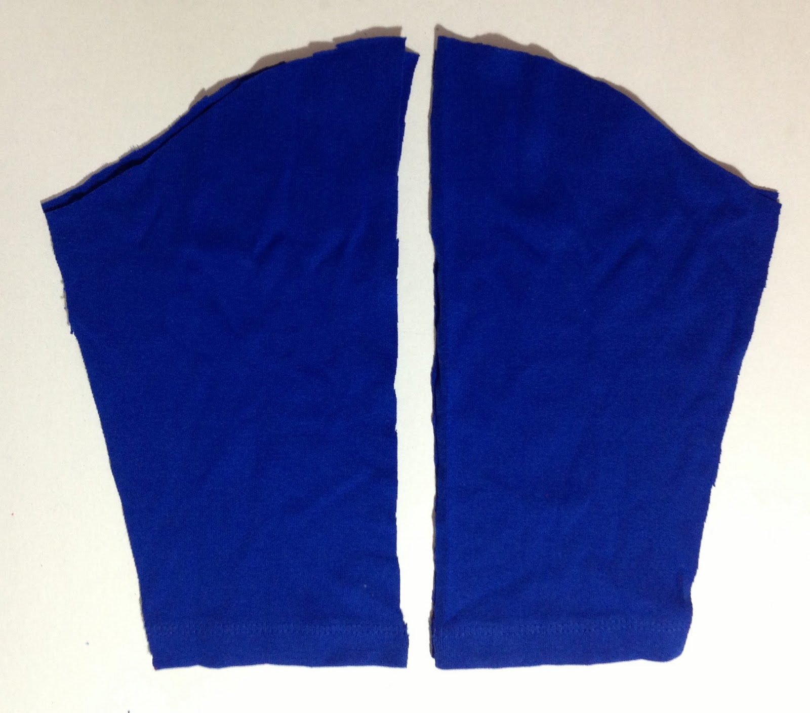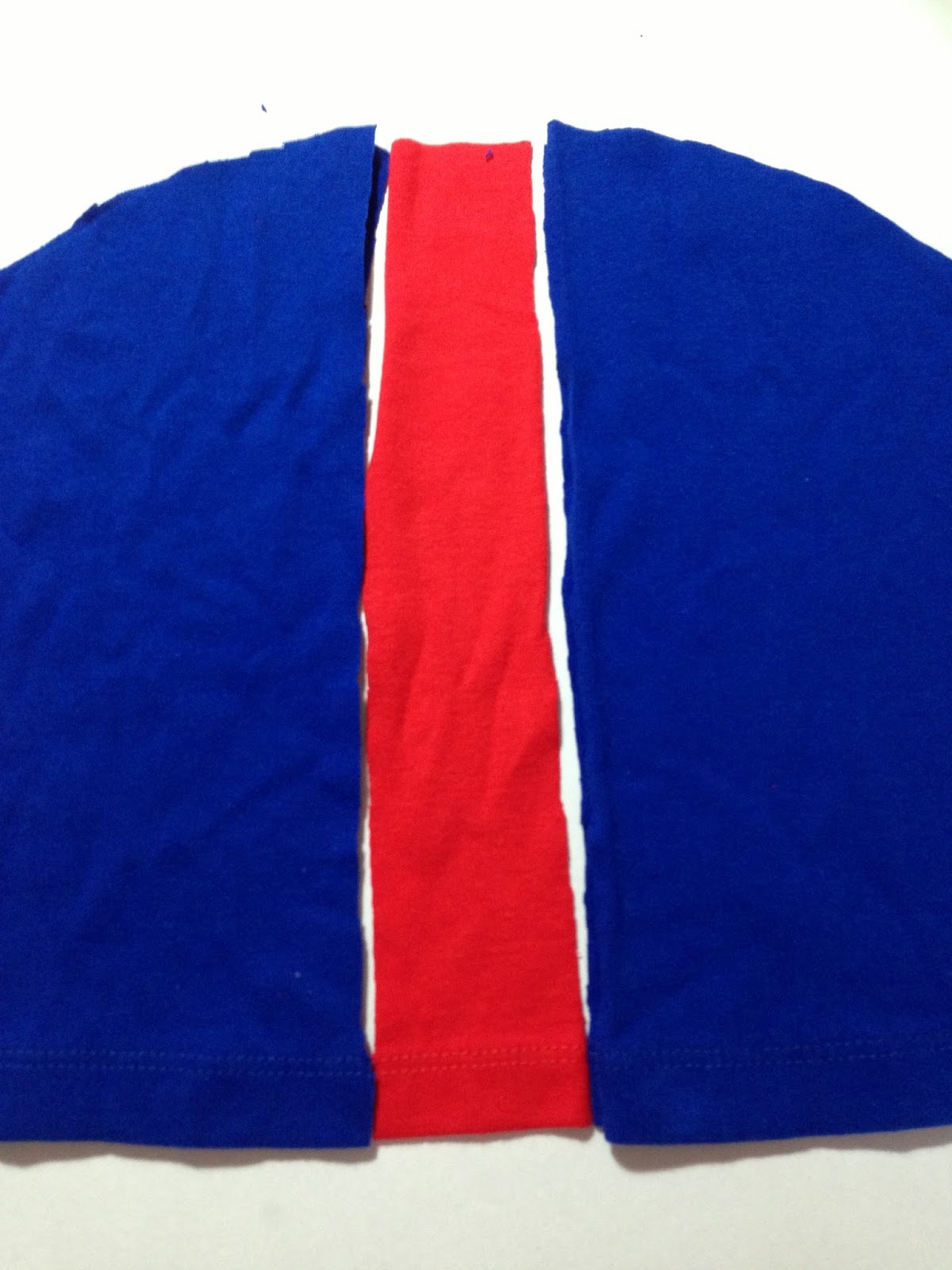 I've cut the sleeves out of the recycled blue sleeves and then cut it through the middle to add a strip of red.