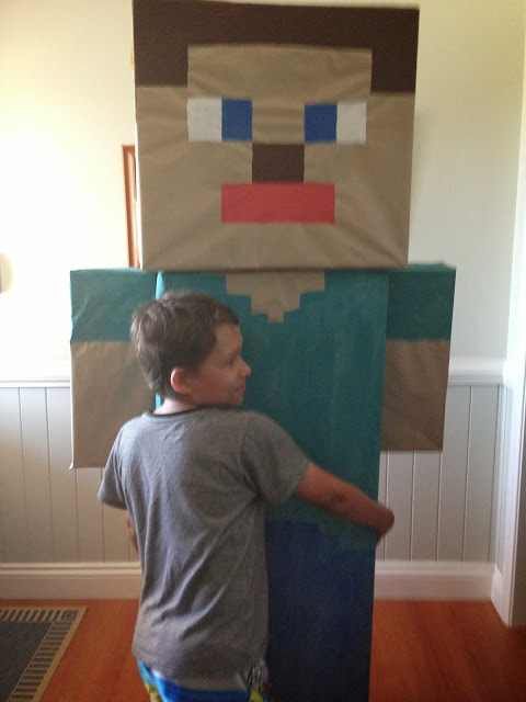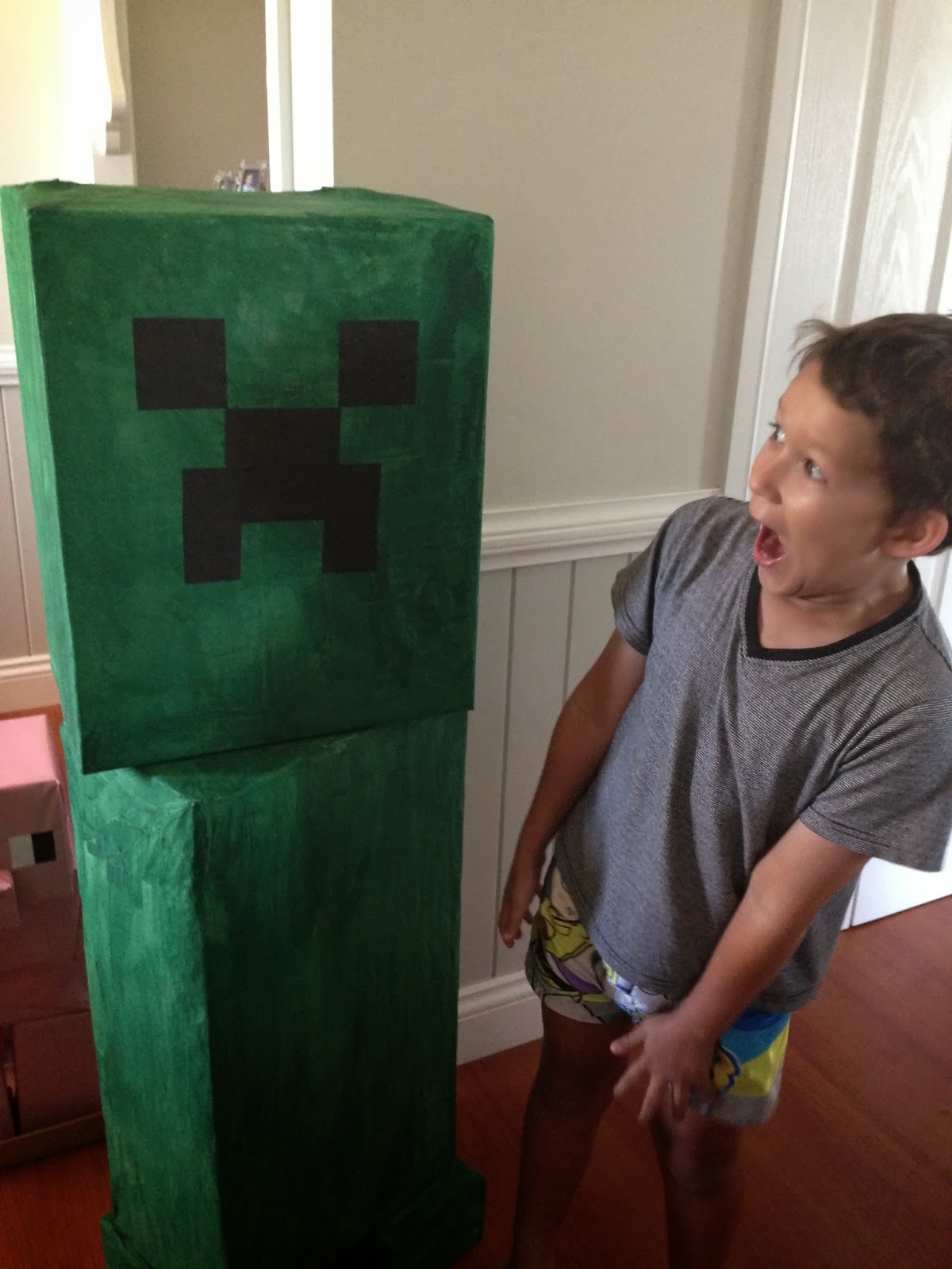 The Creeper was also just two big boxes covered in brown paper before painting, and two shoe boxes to balance it out. I got the template for its face from here. The poor Piggie didn't get a photo opportunity by himself.. you can only just see him peeking out the left corner of the next photo.