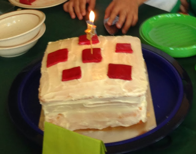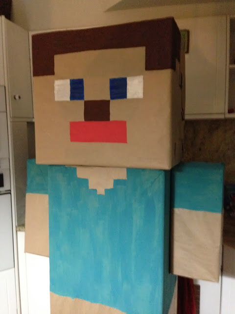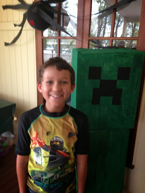 With the help of my darling daughter, we've created a life size Mr. Steve, a Creeper, a Pig, Spiders for decoration, and we came up with a very authentic looking "Cake Block", that was the easiest of all to make. But the absolute hit of the party was the piñata, made to resemble a wall of "Grass Blocks" that each boy had a couple of goes at "Mining".