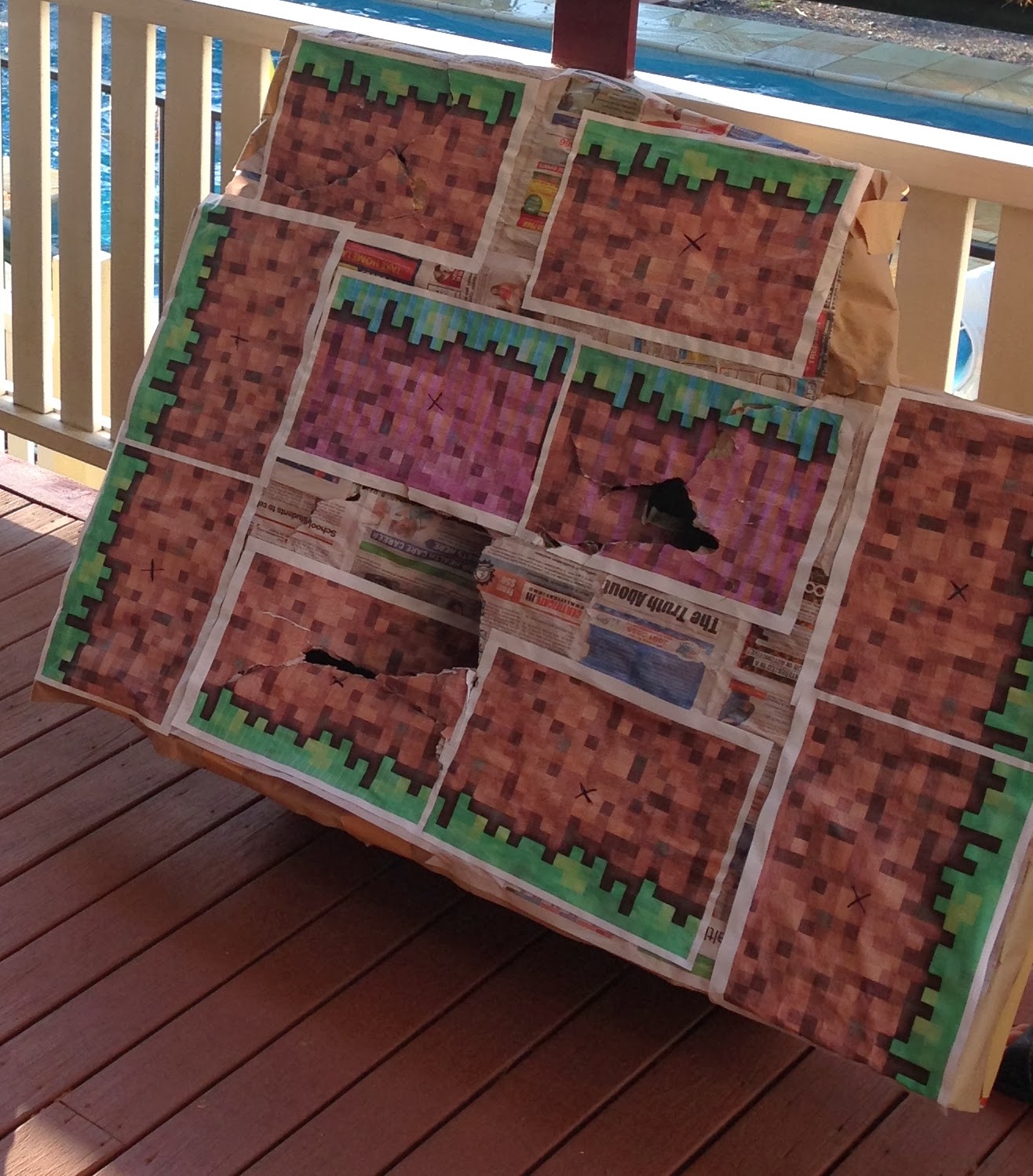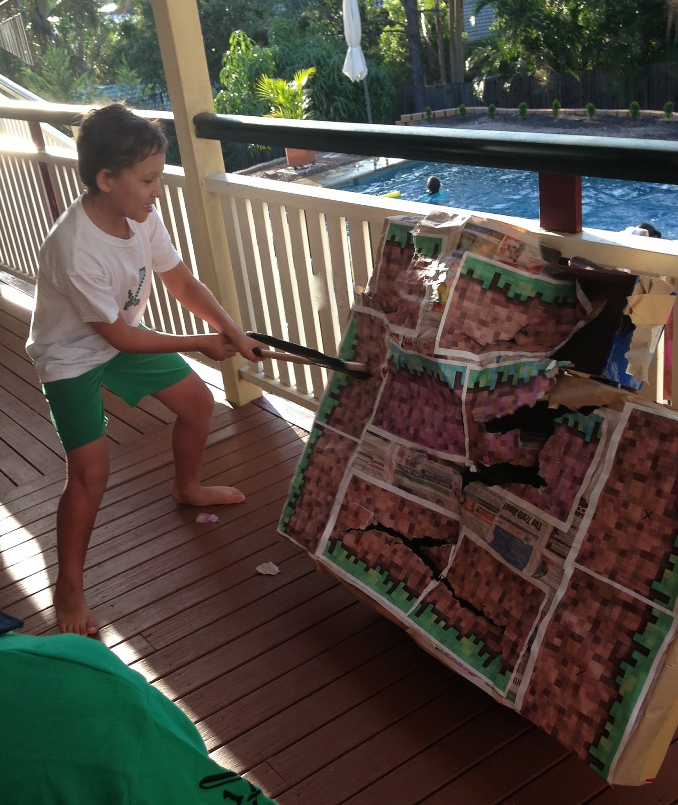 I found the inspiration for the piñata here. Unfortunately, there wasn't a link to a website attached with more instructions, so I'll just tell you what I've done. The whole construction was basically a variety of boxes taped, and hot-glued together. I've placed some take-home goodies inside each box, and then covered the whole thing with newspaper. More layers of newspaper glued on top with kids craft glue, formed a sort of papier mache unit. Then I've printed out "Grass Blocks" from here, to mark each box that was to be "Mined". It was supposed to be strong enough to withstand multiple blows, but weak enough to at least break through by the fifth hit. I cheated a little by cutting a tiny "X" into the middle of each "Grass Block" with a craft knife to ensure the whole piñata doesn't collapse after the first hit.