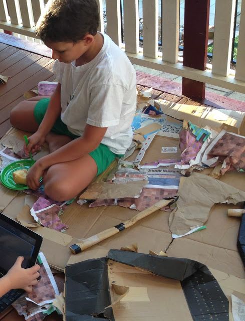 Mr. Steve was made from various sized boxes. A squarish box that once held my printer for his head, the box the pool cover came in for his body, and his arms were made up of two shoe boxes hot-glued together on each side. Every piece was covered with brown paper before painting the parts. We've used normal kids poster paint, and mixed blues, yellows and white together to get Mr. Steve's particular turquoise coloured shirt. I still wanted to paint his "pants" as well, but time just ran out. The face was basically a matter of drawing the shapes with a ruler and pencil, and try and try again till it seemed quite right. I found the inspiration for that here.